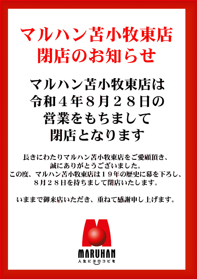 8月28日(日)までは元気に営業中✨ pic.twitter.com/csZaIkV3t0— マルハン苫小牧東店 (@tomahigamaruhan) August 18, 2022