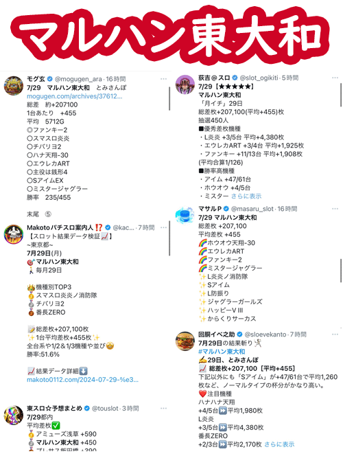 ついで9の日に度々名前の挙がるマルハン東大和に、常連のグランパ中野。
