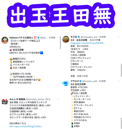 観測範囲内のトップは特定日にスロパチ系取材のあった出玉王田無。
