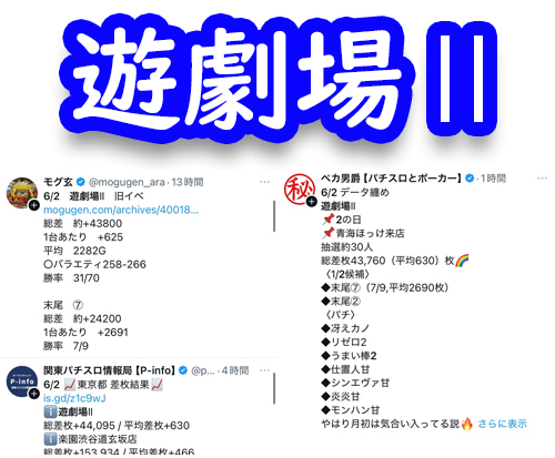 観測範囲内のトップは”2”を関する遊劇場Ⅱ。平均差枚がぶっちぎりでした。