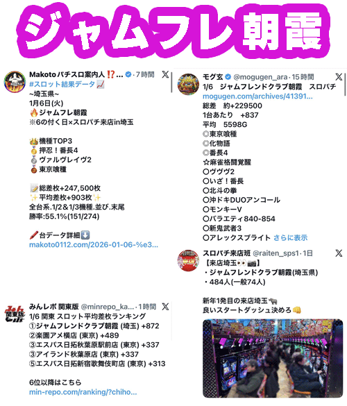 観測範囲内のトップはスロパチ来店もあったジャムフレ朝霞。