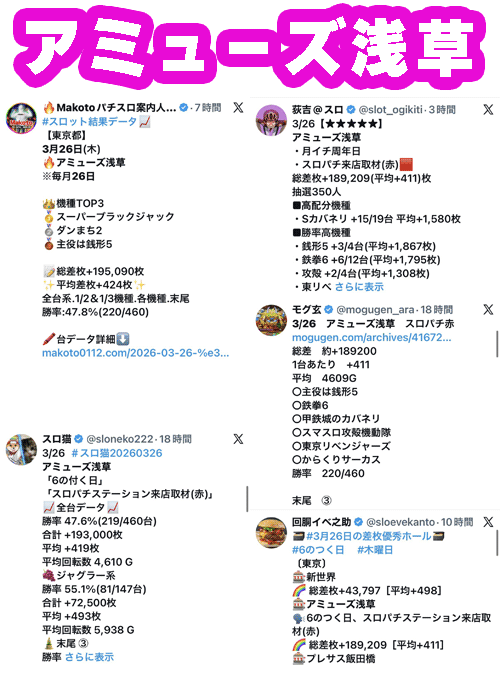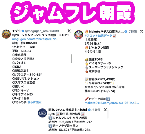 観測範囲内のトップはスロパチ取材で安定の強さのジャムフレ朝霞!